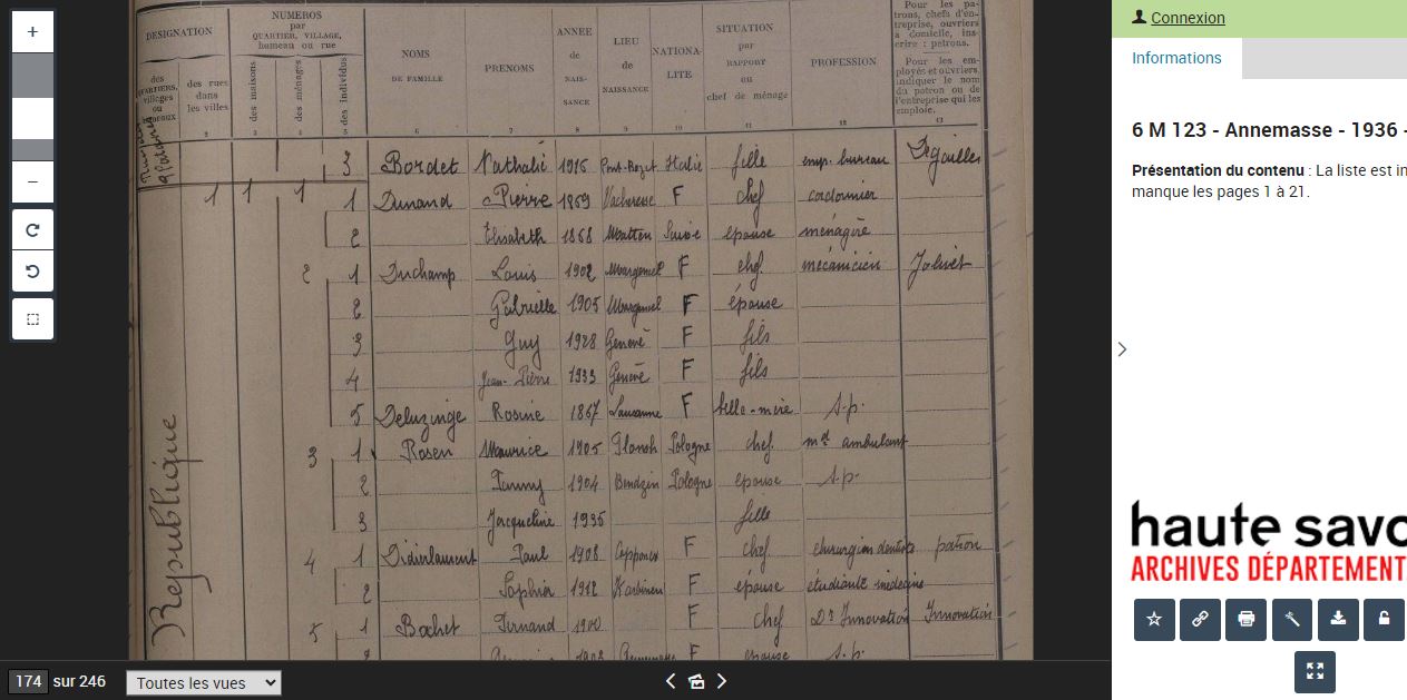 En 1936, on les retrouve à Annemasse, où Louis travaille comme mécanicien au garage Jolivet. Voir la copie de la page du recensement.